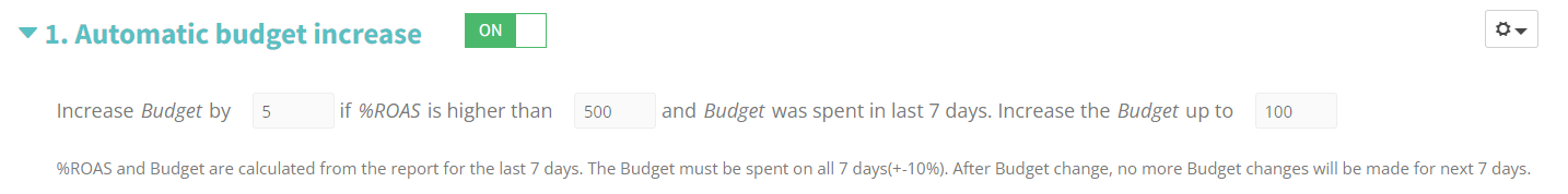 • Automatic Budget Increase – if this option is selected, BlueWinston will automatically increase the budget in the campaign by the specified value if the defined ROAS is reached and the budget has been spent within the last 7 days. You can change the amount by which the budget should be increased, as well as the ROAS that the script should take into account.