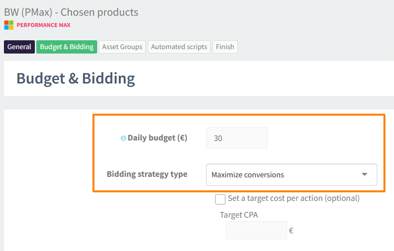 Enter a daily campaign budget (we recommend at least €10 for every 500 products). In our experience, it is better to start with a bidding strategy Maximize conversions first.