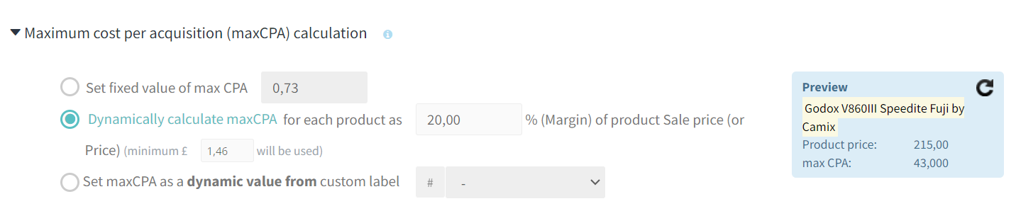 • Automated calculation of CPA – we recommend dynamically calculating the price per acquisition as a % of the product price. You can check the CPA values (as % of product price) in the preview by clicking the Refresh button. We recommend setting it to 20%, possibly according to the margin you are willing to give per order.