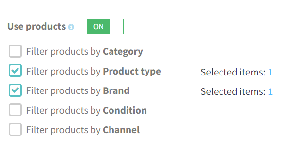 You can choose one filter or several, depending on what products you want to select for your campaign. For example, you can use 3 filters at the same time, such as filtering by category, brand, and price.