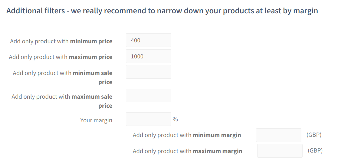 Filters for price and margin