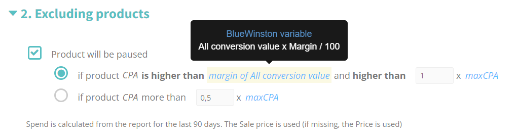 • Exclude (pause) products – if this script is selected, BlueWinston will automatically pause products if they meet the parameters set in the script (e.g. the product had a higher spend than the calculated margin)