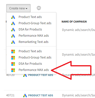 In the list of campaigns, click Create new and select Microsoft Ads Performance Max Ads: