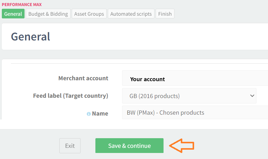 Choose the Merchant account you would like to use the products from, the country where you will advertise, and the campaign name. Then click on Save & continue.
