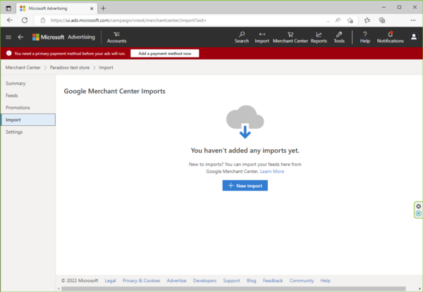 In the next screenshot, you can see the Import tab, that is, the place where you can connect a Google Merchant account. Choose a new import: