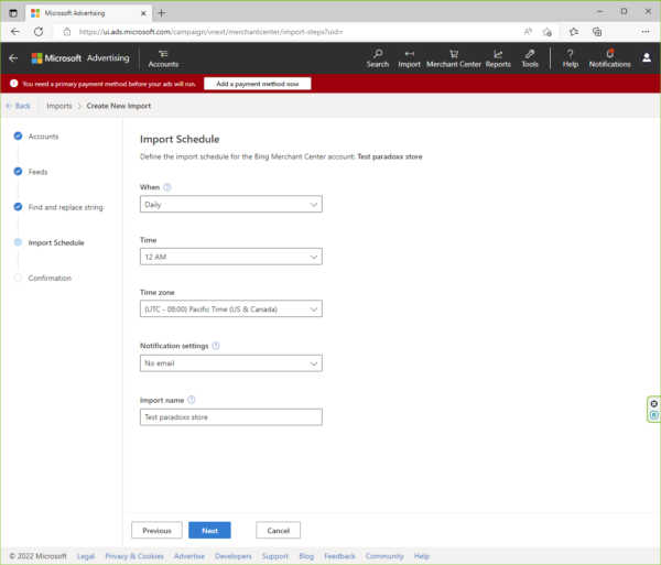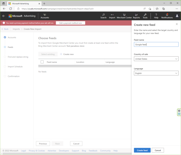 After you select the GMC account the Microsoft Ads will ask you to create a feed. Fill in the name of the feed, country of sale, and language: